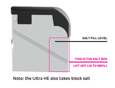 DO NOT fill salt compartment higher than the lift handles moulded into the sides of the cabinet.